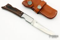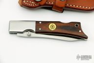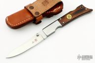 This Gunstock 1 from Al Mar Knives features a drop point satin finish blade with thumbstud. The handle is comprised of stainless steel bolsters and titanwood scales with faux bullet casing over stainless liners and lockbar. Lanyard tube in pommel. Comes with a small leather belt sheath designed to look like a holster. Excellent condition.
