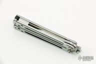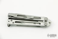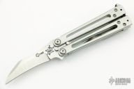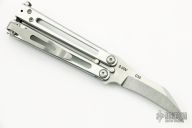 This Utility Balisong by Korth Cutlery features a satin finished blade with false top edge. The handles are satin finished stainless steel with satin finished titanium spacers, has a black G-10 t-latch, tip up deep carry stainless steel clip. #038 on the blade. Excellent condition. Comes with a velcro belt sheath.
