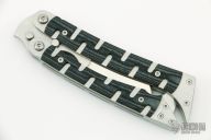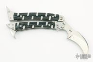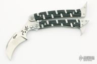 This Balisong by Korth and Sheng features a satin finished hawkbill blade. The handles are satin finished stainless steel with black/grey G-10 scales. Excellent condition. #007 on the blade. Comes with a velcro case.