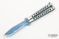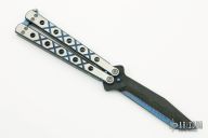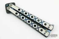 This Balisong from Warren Thomas and Brian Fellhoelter features a titanium and carbon fiber laminated chisel ground blade with finger print anodizing. The handle is comprised of anodized titanium handles with titanium spacers and an anodized titanium T-latch. Includes a zippered case. Excellent condition.