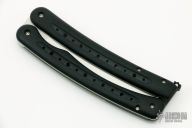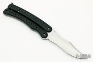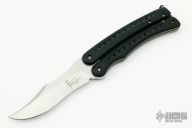 This Bowie Balisong by Todd Begg features a hand rub satin finished recurve blade with notched thumbrest, .140" blade stock and 1.282" blade depth. The handles have black G-10 scales and backspaces, bead blasted titanium liners and a black G-10 T-latch. Comes with velcro case. #003 on blade. Has a couple of light scratches, otherwise excellent condition.