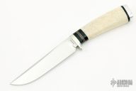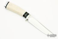 This knife by George Englebretson features a mirror polished blade with .154" blade stock and 1.059" blade depth, hidden tang construction. The handle has nickel silver guard, copper spacer, oosik scale and aluminum butt plate. Has a couple light scratches, otherwise excellent condition.