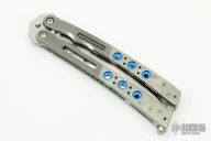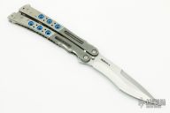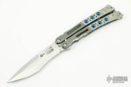 This Guardian Angel balisong by Flavio Ikoma is Prototype B, it features a satin finish blade with a sharpened top edge, and two-tone bead blasted and orange peel finished titanium handles, matching spacers and T-latch. Includes IKBS (Ikoma-Korth Bearing System) for smooth action. Jeweled interior. Handles are notched for grip. Excellent condition. Comes with a zippered case.