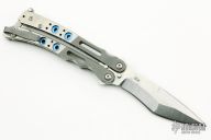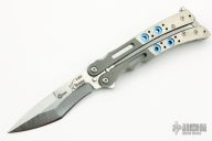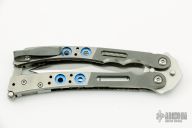 This Small Guardian Angel balisong by Flavio Ikoma is #004, it features a satin finish blade with a sharpened top edge, and two-tone bead blasted and orange peel finished titanium handles, matching spacers and T-latch. Includes IKBS (Ikoma-Korth Bearing System) for smooth action. Jeweled interior. Handles are notched for grip. Excellent condition. Comes with a zippered case.
