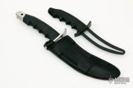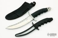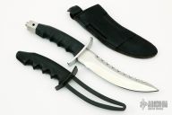 This Hobbit Warrior features a satin finished blade with serrated top edge, 7/32" blade stock and 1 1/2" blade depth, hidden tang construction. The handle has a stainless steel double guard, black polymer handle, and a stainless steel butt. Comes with a black leather sheath and trainer blade. Has a few light scratches on the blade and handle. Good condition.
