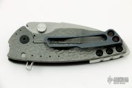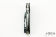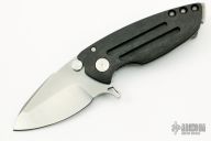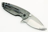 This Hyper 90 from Direware Custom Knives is modeled after the original early version of this knife. It features a two-tone finished multi-ground blade with notched thumbrest, flipper and dual thumbstuds. The handle has a marble carbon fiber and carved and blasted titanium frame, anodized and tumbled tip up clip. Comes with original box. New from maker!
