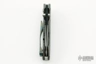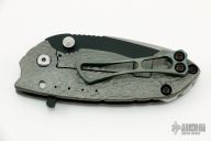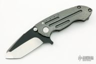 This S-90 from Direware Custom Knives is modeled after the original early version of this knife. It features a two-tone finished tanto blade with notched thumbrest, flipper and dual thumbstuds. The handle has a carved and blasted titanium frame, anodized and tumbled tip up clip. Comes with original box. New from maker!