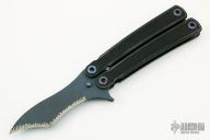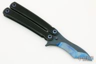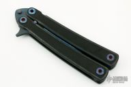 This XL Balisong from Warren Thomas features a fingerprint anodized titanium chisel ground blade with carbidized edge. The handles are black G-10 with titanium spacers. Includes a zippered case. "P1" on the blade. Excellent condition.