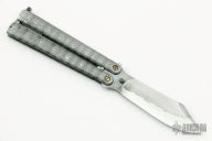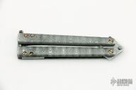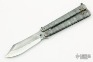 This Balisong by Chuck Gedraitis features a clip point blade with hamon. The handles are Spirograph Damascus handles with Damascus spacers and T-latch. Excellent condition. #036. Nice early balisong from Chuck.