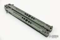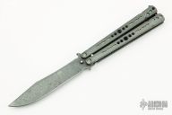 This Balisong from Darrel Ralph features a Damascus blade, #18 on blade. The handle has a Damascus frame with tritium inlays over heat colored spacers and fileworked T-latch. Has a couple light scuffs, otherwise excellent condition.
