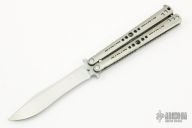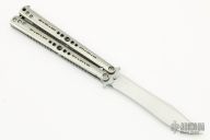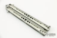 This Balisong from Darrel Ralph features a hand rub satin finished blade, #19 on blade. The handle has a polished titanium frame over stainless steel spacers and fileworked T-latch. Excellent condition.