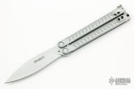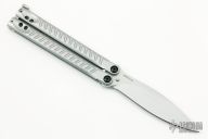 This Kimura Balisong by Bradley Cutlery has a bead blasted Sandvik drop point blade. Handle is bead blasted 410 stainless steel with T-Latch closure. Excellent condition. Great mechanics. Good closure. I'm not exactly sure which model this is.