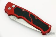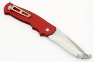 This Triple Hollow Grind M2 by Walter Brend features a satin finished blade with triple hollow grind, notched thumbrest. "02/14" and X2 on blade. The handle is red aluminum with non-slip inserts, tip up satin finished stainless steel clip. Comes with original box and zippered case. Excellent condition.