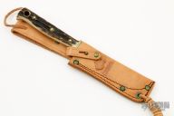 This Hunter's Pal by Puma Knives features a satin finished blade with notched spine and false top edge, .191" blade stock and .810" blade depth, full tang construction. The handle has a brass guard with stag scales. Includes original leather sheath, box and papers. #20271 on the guard. Excellent Condition. Made in 1972.