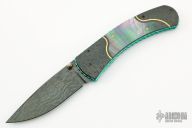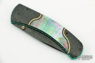 This Integral frame linerlock by Matthew Lerch features a Doug Ponzio mosaic parqua Damascus blade with single gold fileworked thumbstud with black lip pearl inlay. The handle has matching Damascus bolsters and butt with gold inlays, black lip pearl inlays with gold screws, fileworked and anodized titanium liners and a fileworked Damascus backspacer. Nice detent, lockup and blade seating. Excellent condition. Comes with a zippered case.
