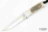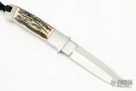 This Integral Boot Knife from Dietmar Kressler features a clip point hand rubbed satin finish blade with sharpened top edge, .159" blade stock and .958" blade depth at the ricasso. The handle is comprised of natural stag scales over red liners and integral construction with full tapered tang. Lanyard tube in pommel. Includes brown leather sheath with belt loop and a zippered case. Excellent condition. A beautiful piece.
