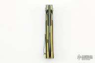 This Sparrow Flipper by Emmanuel Le Brun features a Damascus blade with fullers and flipper tab. The handle has polished dovetail zirconium bolsters, Darkmatter scales, anodized titanium frame, and pivot collars. Backspacer is a sandwich of fat carbon and yellow g10, same as the liners. Matching tip up clip (crystalized Zircuti). Very smooth. Nice detent, lockup and blade seating. Comes with original zippered case and COA. New from Maker!