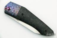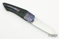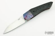 This Prototype Front Flipper by Emmanuel Le Brun features a hand rub finished blade with notched flipper. The handle has Mokuti bolsters, clip and backspacer. Anodized titanium frame, and Darkmatter purple scales. Very smooth. Nice detent, lockup and blade seating. Comes with original zippered case and COA. New from Maker!