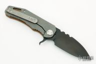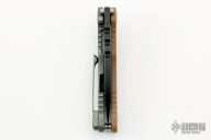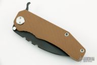 This 187F by Medford Knife and Tool features a gray PVD coated blade with notched thumbrest and flipper. The handle has a tumbled titanium lockside with Coyote Brown G10 scale and tip up titanium clip. Comes with original box, drawstring bag and papers. Excellent condition. Nice detent, lockup and blade seating.