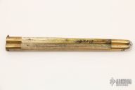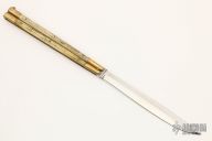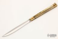 This Balisong features a satin finished blade with a false top edge. The handles are made of brass channel construction with bone scales and a brass T-latch. Has some scratches, but good condition for its age.