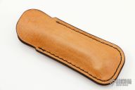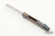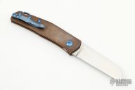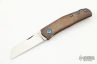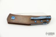 This Monte Carlo by Jens Anso features a hand rub satin finished sheepsfoot style blade with nail nick. The handle has tumbled copper scales over dual inlaid liners with double detent that provides a crisp click in the open, closed and half stop positions. Anodized titanium hardware, backspacer with lanyard bail and machined tip up clip. Includes original leather slip sheath and COA dated June 2021 and s/n 513. Excellent condition.