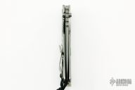 In 1988, he began making specialized knives for use by the military. This turned out to be fortunate turn of events, both for Mick and for the knife using world at large. Mick’s approach was to not get burdened by the weight of past designs. He started with a tabula rasa, a clean slate, informed only by his own experiences and knowledge of what a soldier needed in a knife. The knives he made didn’t look like the hunter-inspired knives seen in most PXs; instead they were almost brutish in their functionality: beefy, solid, and with unbreakable ¼” stock full tangs. These knives were the first indication of his innovative approach: in addition to their utilitarian design, the knives carried a subdued finish and subdued sheaths. No one carrying a Strider knife was going to be spotted because of sunlight glinting off of polished steel or a glossy leather sheath. Soldiers, policemen, and other men going into harm’s way couldn’t buy them fast enough. Mick sampled some good ideas, but made them great. For instance, he was not the first to wrap a knife handle with paracord, but he was the first to do it in a way that was tough enough for sustained infantry use. His knife line grew over the following years to include different varieties of fixed blades, all distinctive and many with specialized uses. But constant in all of them was a disregard for convention, and a desire to try new ideas. An example of this was the Ajax – it featured a very wide blade surface clearly designed to inflict damage. It drew on the weapons carried by Roman legionnaires, yet was modern and usable in the 21stCentury battlefield. Mick also worked on his technical skills, always striving to become better at the physical craft. At the 2002 Blade Show, a group of the best tactical knifemakers in the country decided to compete with each other to produce the most innovative and interesting fixed “battle blade” at the show. Mick’s entry, an incredible integral knife made out of ½” titanium stock with a zippered composite blade, gorgeous handles, and integral guard was the unanimous winner, and effectively retired the competition.