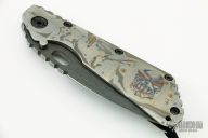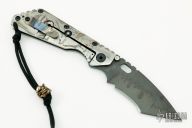 This Mick Strider custom XL framelock folder is a "Steampunk" Starlingear exclusive, it features a flame finished tanto recurve titanium blade with notched thumbrest and a thumbhole. The handle has a laser engraved titanium frame with a matching clip. Includes Hinderer "Lock Bar Stabilizer" for maximum reverse lock retention. Perfect lockup, blade seating and detent. Comes with a black Everett Leather Starlingear case and a Starlingear bead. Excellent condition.