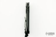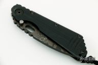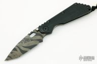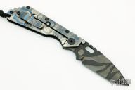 This Duane Dwyer Custom SMF features a chisel ground tanto blade and a thumbhole. The handle has a black G-10 A-side with 3 gooves near the butt, the b-side is lazer etched tumbled titanium, has lock bar stabilizer. Matching titanium clip, tip up carry. Notches on thumbrest, rear of handle, and lockup. Includes Hinderer "Lock Bar Stabilizer" for maximum reverse lock retention. Strong detent, and nice lockup and blade seating. Comes with a Greg Everett Leather pocket sheath and Starlingear/Strider Knives bead and lanyard. Has a couple light scuffs, otherwise excellent condition.