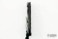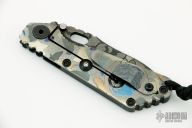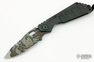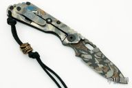 This custom DDC SnG CC from Duane Dwyer and Starlingear features a laser etched chisel ground blade and a carbon fiber and laser etched titanium handle. Laser etched titanium clip. Notches on thumbrest, rear of handle, and lockup. Includes Hinderer "Lock Bar Stabilizer" for maximum reverse lock retention. Includes a custom Greg Everett Leather sheath with Strider and Starlingear logos, and bronze bead Starlingear/Strider Knives Bead. Excellent condition.