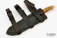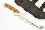 This One of a Kind Hog Hunter by Jon Graham features a satin finished double edged blade with fileworked thumbrest and index finger ring, .173" blade stock and 1.564" blade depth, full tang construction. The handle has rag micarta scales with mosaic pins and black liners, extended tang with bottle opener and lanyard hole. Comes with a brown leather sheath with leg straps. Excellent condition.