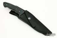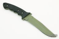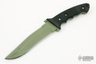 This fighter by Allen Elishewitz features a green coated double edged blade with .199" blade stock and 1.318" blade depth, full construction. The handle has black G-10 scales. Comes with a black leather sheath. Has some light staining on the blade, otherwise excellent condition.