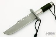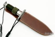 This TAD Edition Survival Bowie by Farid Mehr features a bead blast finished blade with sawteeth on the spine, .237" blade stock and 1.601" blade depth, hidden tang hollow handle construction. The handle has a bead blasted stainless steel guard, hollow stainless steel handle with cord wrap, removable stainless steel butt cap with o-ring. Comes with a brown leather sheath. Excellent condition. Marked PROTOTYPE.