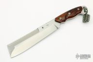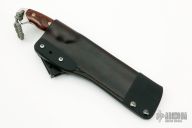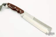 The Custom Razel SS7 by Jon Graham is a work tool with the look of a cleaver and the heft of a hatchet. The full-tang satin finished blade is .242" thick and has 1.803" blade depth, serrated and sharpened top edge, fileworked spine. The butt features a lanyard hole and bottle opener. The handle has nicely contoured desert ironwood burl scales with mosaic pins and red liners. Comes with a black leather and kydex sheath. Excellent condition.