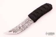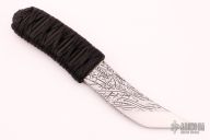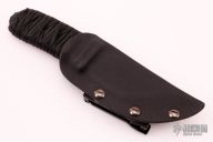 The Combat Kiridashi by Mike Snody features a hand rub satin finished chisel ground blade with carved/textured flats, .153" blade stock and 1.5" blade depth, hidden tang construction. The handle has black cord wrap over black paracord. Comes with a kydex sheath with TekLok. Excellent condition.