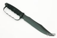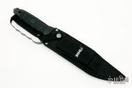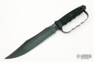 This knife features a black spear point blade with partially serrated edge and notched thumbrest, .230" blade stock and 1.630" blade depth, hidden tang construction. The handle has a black stainless steel D-guard and butt, and black plastic handle. Comes with a black nylon sheath with belt loop and original box. Excellent condition.