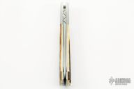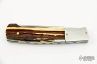 This Mid-Lock by W.D. Pease features a hand rub satin finished blade with nail nick and fileworked spine. The handle is comprised of stainless steel bolsters, gold plated screws, stag scales, stainless steel liners and fileworked lockbar/backspacer. Comes with a zippered case. Has a few light scratches, otherwise excellent condition.