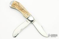 This Saddle Horn Trapper by Tobin Hill features 2 hand rub satin finished blades with nail nicks. The handle has polished and fluted stainless steel bolsters, mammoth ivory covers with stainless steel escutcheon, fileworked stainless steel liners, stainless steel springs. Has half-stops, flush in all positions. Excellent condition.