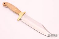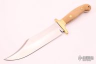 This Bowie by Jimmy Lile features a satin finished clip point blade with a false top edge, .256" blade thickness and 1.818" blade depth, full tang. The handle has a brass guard and maple scales with brass pins. "Hand Made by James B. Lile" on the the blade. Has a couple light scratches, otherwise excellent condition.