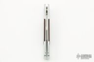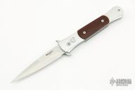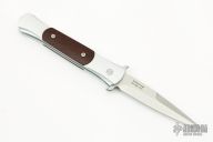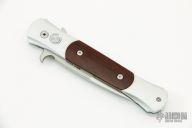 The frames and inlays for each DON are completely 3D machined, curved and fluted for a completely custom feel. Super smooth coil spring action! Because of the complex machining and amount of detailed hand work involved with the DON, their production will be very limited each year." This is a Don featuring a satin blade, silver aluminum handle, and cocobolo inlays. Includes the original box and papers. Excellent Condition.