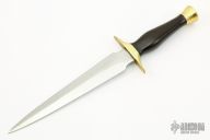 This Dagger by Jimmy Lile features a double edged mirror finished blade with .177" blade thickness and 1.280" blade depth, full tang. The handle has a brass guard and butt with black linen micarta grip. "Hand Made by James B. Lile" on the the blade. Has a light stain on the blade, otherwise excellent condition.