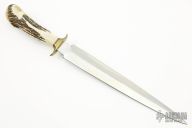 This Dagger by Jimmy Lile features a double edged satin finished blade with .181" blade thickness and 1.465" blade depth, full tang. The handle has a brass guard with a crown stag grip. "Hand Made by James B. Lile" on the the blade. Excellent condition.