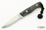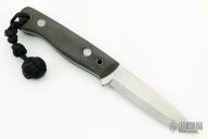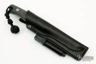 This Bushcraft knife by Daniel Koster features a satin finished scandi ground blade with notched thumbrest, .125" blade stock and .899" blade depth, full tang construction with rubber scales. Coems with a black leather sheath with a firesteel. Has some light scratches, otherwise excellent condition.
