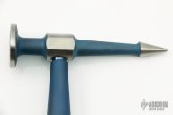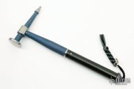 This war hammer by Jeremy and Ken Marsh has an anodized titanium head. Hammer head is 6" long with a 1.625" diameter. Anodized titanium with carbon fiber handle. Great look and feel. Leather lanyard with skull bead on pommel. Some snail trails in finish on head and handle but overall excellent condition.