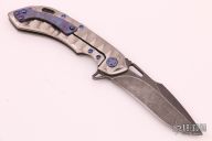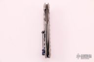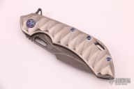 This Wayfarer 247H from Olamic Cutlery features a black tumble finished spear point blade, thumbhole, notched thumbrest and flipper. The handle is orange peel finish sculpted titanium with an anodize finish titanium pocket clip is positioned for tip up carry with a ceramic ball inlay, floating and sculpted titanium backspace (multicolor nugget backbar). The Wayfarer 247 is very comfortable in the hand and flips well with no wrist action needed. Blade is centered when closed and locks up with no play. s/n T123H. Comes with original box and COA dated 4/4/18. Excellent condition.
