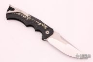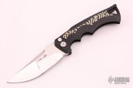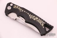 This Auto Tighe Fighter by Brian Tighe features a compound ground drop point blade with swedge and notched thumb rest. Button release. The handle is comprised of black G-10 with glow in the dark inserts, over a notched G10 backspacer with lanyard bail. Titanium tip up clip with ceramic ball insert. Comes with zippered case and makers card. Excellent condition.