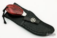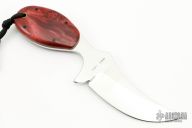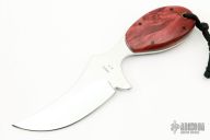 This knife by Mickey Yurco features a mirror finished blade with .163" blade stock and 1.725" blade depth, full tang construction. The handle has dyed maple burl scales with black pins and a brass lanyard hole. Comes with a hand tooled black leather sheath with a belt loop. Excellent condition.