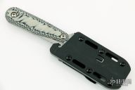 This MK III E.C.S. features a tiger stripe stonewashed blade and black/tang G-10 scales. .129" blade thickness and 1.110" blade depth, full tang construction. Notched thumb and finger rests. Sturdy Delrin sheath with lockup also has a detent to keep the knife from rattling in the sheath. Excellent work. Light Sheath Marks on blade, and a couple of  scratches on the sheath, otherwise excellent condition. Comes with a zippered case.