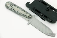 "I am a folder maker. While there will always be the occasional fixed blade, folders are my passion. The steels I enjoy working with include CPM154, ATS-34, 440C, S30V, and Stainless Damascus from Devin Thomas. All of the metal parts on my knives that can be Titanium are Titanium including frames, liners, thumbstuds, bolsters, clips and spacers. Pretty much everything except for the blade. I often anodize a substantial portion of my titanium, and can get a deep green that few makers succeed at. As far as handle materials go, I mostly use Carbon fiber, G10, or Micarta. I use large bronze pivot bushings in all of my folders, and either Nylatron or Bronze washers. All of my parts are made in-house except the screws. I have an old Bridgeport Mill, an older Logan Lathe (1943), a Hardcore grinder, and various other tools, lots of them made by myself. I also do all of my own Heat treating in an EvenHeat Oven." My knives have won several major awards, including Best Tactical Folder at the Blade Show 2011.
