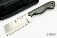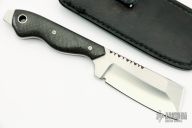 This SS3 Razel fixed blade by Graham Knives features a satin finished blade with two sharpened edges and fileworked thumbrest, .182" blade stock and 1.221" blade depth, full tang construction. The handle is comprised of carbon fiber scales with red liners, mosaic pins and lanyard tube. Exposed tang pommel. Includes black leather sheath with clip. Excellent condition.