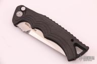 This Large Tighe Fighter Automatic model has a bright stonewashed drop point blade and a carbon fiber handle.
